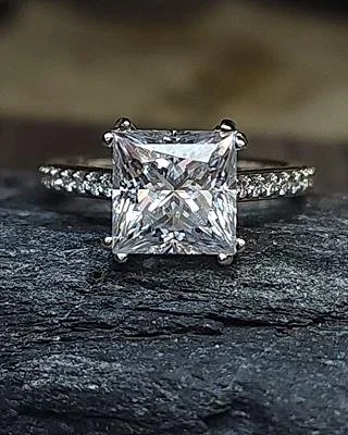 A Moissanite in an emerald cut, with lab diamonds on the side from Stuller.